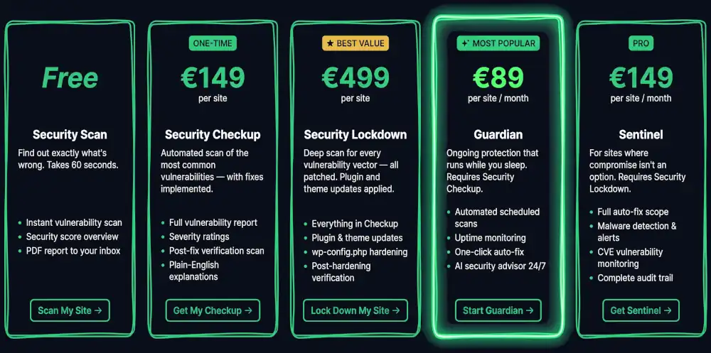 A family bakery’s WordPress site was silently injecting spam links for three months. No error messages. No alerts. Their Google ranking dropped from position 2 to page 8 — invisible to every local customer searching for them. Recovery took four months and €1,100 in SEO repair work. The cause: an abandoned plugin, last updated in 2021.